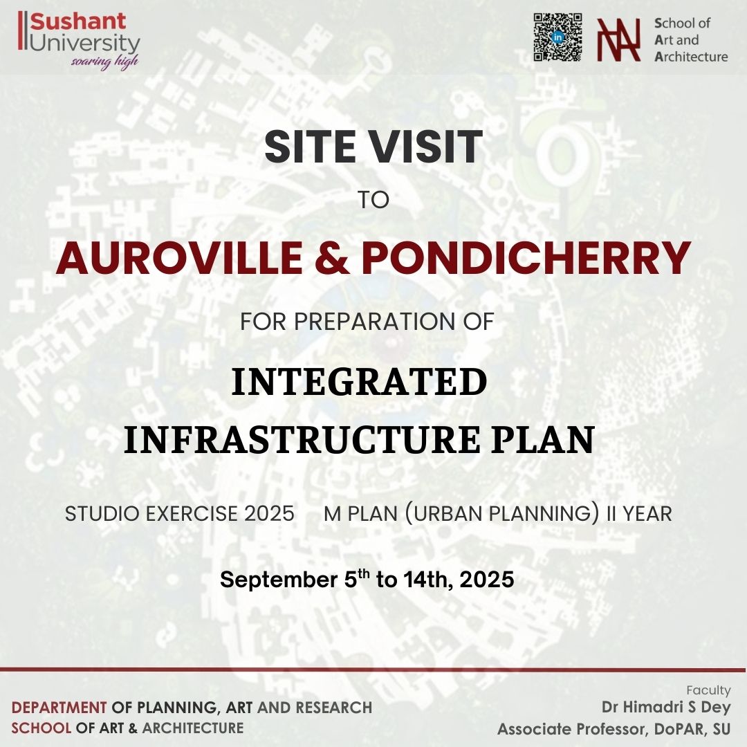 As part of the Studio Exercise 2025, students of M.Plan (Urban Planning), II Year from School Of Art & Architecture, Sushant University are undertaking a site visit to Auroville and Pondicherry (September 5–14, 2025).
