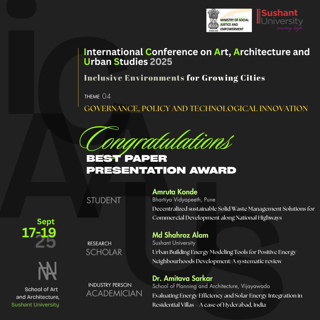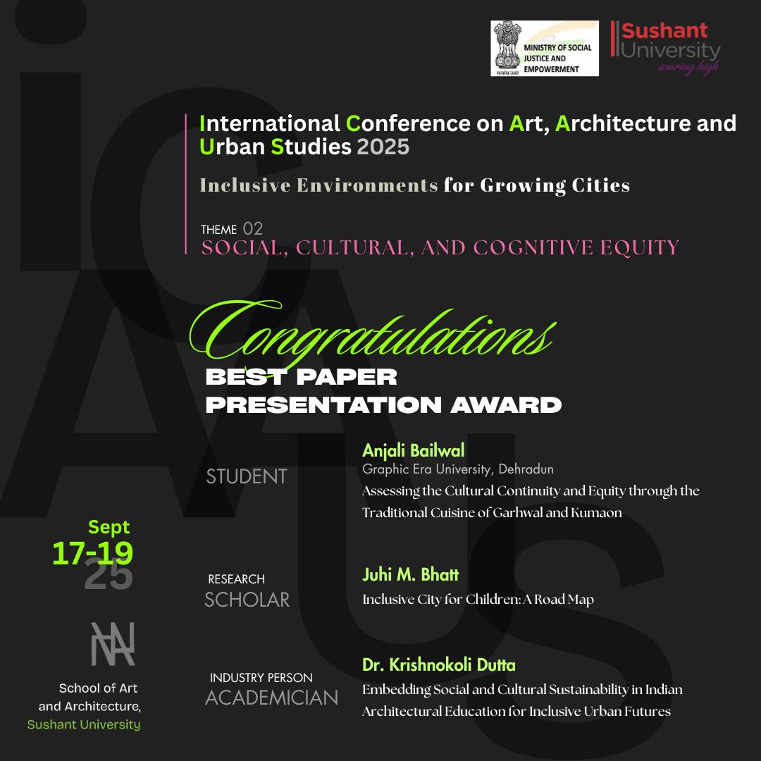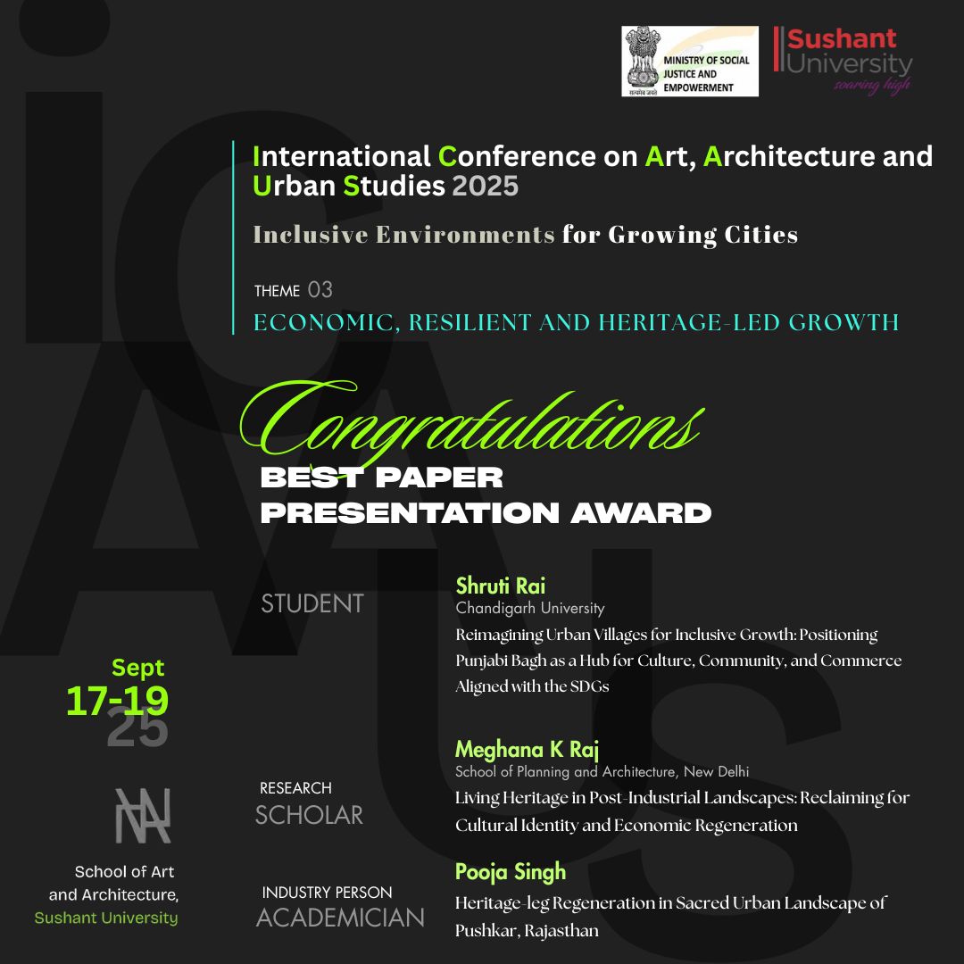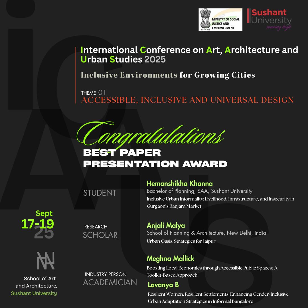 ICAAUS 2025 is the 1st International Conference on Art, Architecture & Urban Studies, organized by the School of Art & Architecture, Sushant University. This conference aims to foster discussions and innovations around Inclusive Environments in Growing Cities.